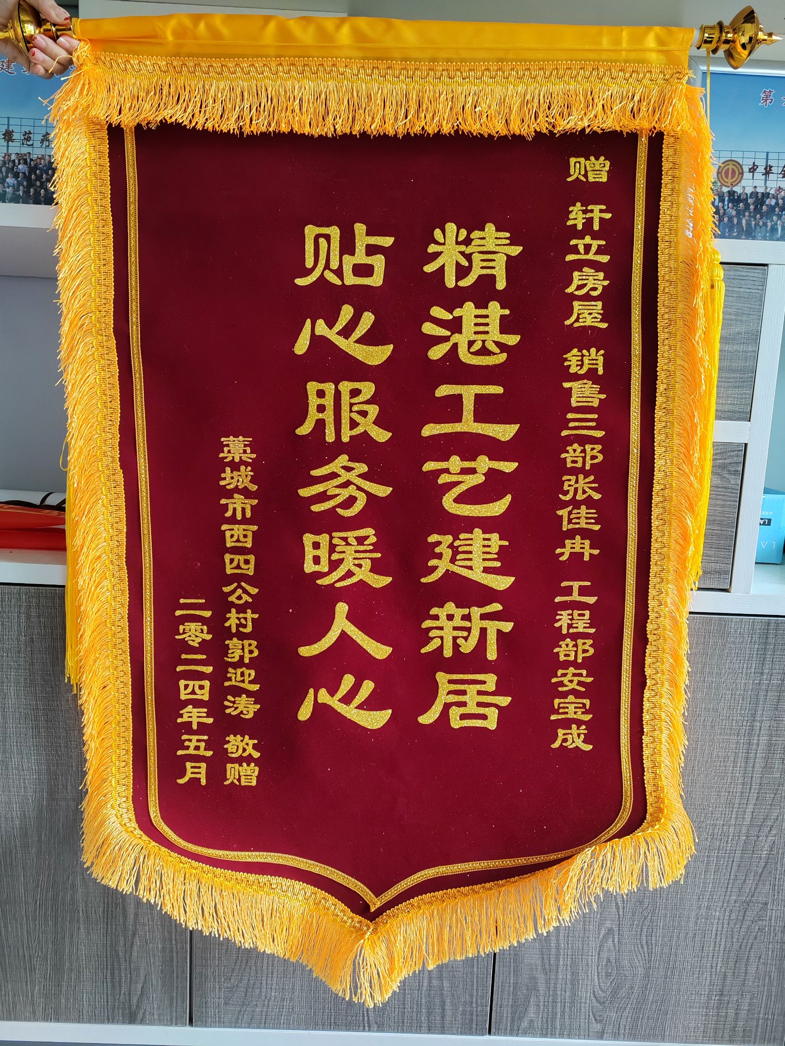 今天,我們收到了一面來自石家莊市藁城區(qū)業(yè)主郭先生送來的錦旗,上面寫著“精湛工藝建新居,貼心服務(wù)暖人心”。這面錦旗不僅是業(yè)主對軒立房屋精湛工藝和卓越服務(wù)的肯定,更是對軒立所有工作人員辛勤付出和專業(yè)技能的認(rèn)可。